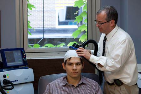 Transcranial Magnetic Stimulation or TMS is a noninvasive procedure (meaning it does not enter the body) that is used to stimulate a part of the brain using a magnetic field. This magnetic field can pass through the head safely and painlessly. TMS can be used to change activity in the brain and correct abnormal activity occuring due to illness. Numerous studies have shown that TMS can have a lasting positive effect on mood in patients with depression. The form of TMS used for therapy is called Repetitive Transcranial Magnetic Stimulation, or rTMS. A number of different protocols and devices have been cleared by the FDA for this purpose.